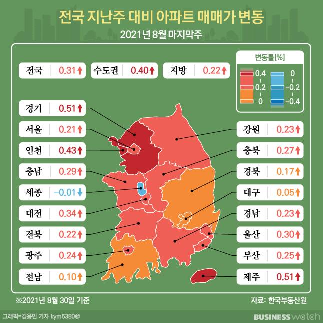 전국 기준으론 0.31%로 한주새 0.01%포인트 확대됐다. 경기 역시 0.51%로 0.01%포인트 확대됐고, 인천은 0.41%에서 0.43%로 0.02%포인트 확대됐다.