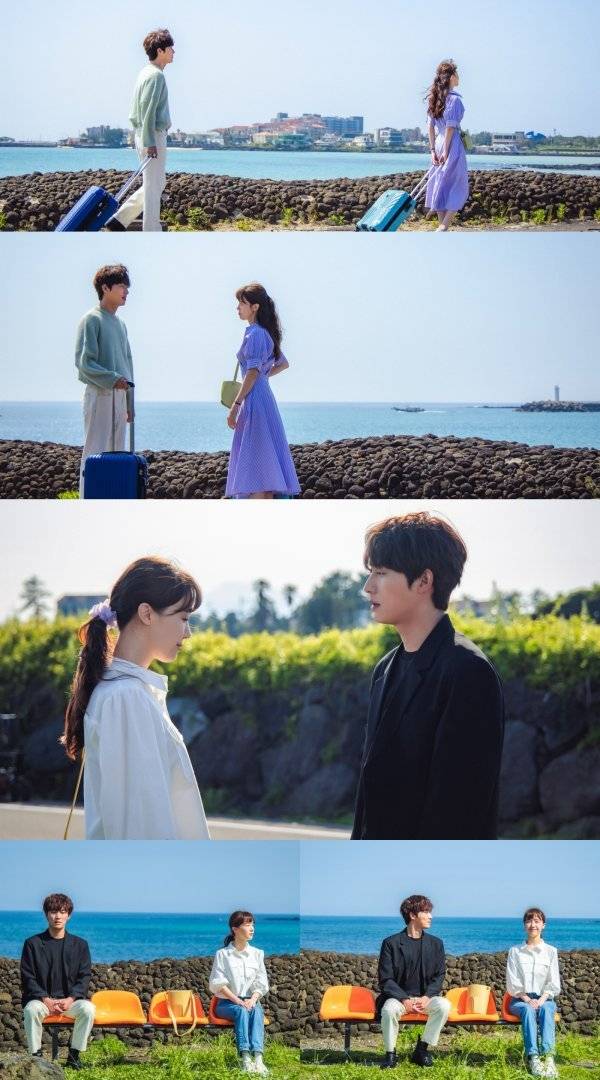 이 가운데 공개된 송이와 도겸의 투샷이 담긴 스틸은 오늘(4일) 밤 방송되는 4회 마지막 회에 대한 궁금증을 더욱 고조시킨다. 보는 것만으로도 힐링 되는 제주도의 푸른 바다를 배경으로 두 사람이 서 있는 모습은 한 폭의 그림처럼 아름답지만 그 분위기만큼은 쉽게 예측할 수 없어 눈을 뗄 수 없게 만든다. 여행의 막바지라는 것을 보여주 듯 캐리어를 끌고 있는 송이와 도겸. 이들은 나란히 서 있는 것이 아닌, 앞서가는 송이의 뒤를 따라 걷는 도겸의 모습이 담겨있는가 하면, 서로를 마주 보고 서 있는 두 사람의 표정이 더욱 호기심을 자극한다. 특히 버스 정류장에 나란히 앉아 있는 두 사람이 포착된 스틸에서는 서로의 엇갈린 시선을 엿볼 수 있어 이들 커플의 엔딩을 그려낼 마지막 회를 더욱 기다려지게 만든다.