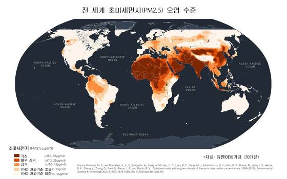 또, 10억 명의 어린이는 초미세먼지 농도가 35㎍/㎥를 초과하는 위험한 수준의 대기오염에 노출되고 있다.