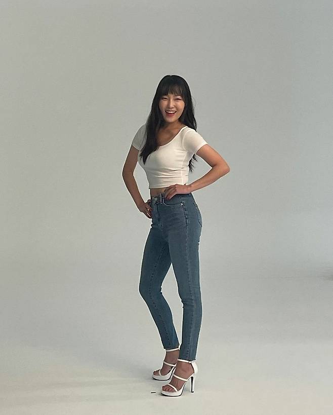 이은지는 가녀린 어깨 라인과 몸매가 그대로 드러나는 흰색 미니 원피스와 배가 살짝 드러나는 흰색 크롭티와 청바지를 입은 채 미소를 짓고 있다.