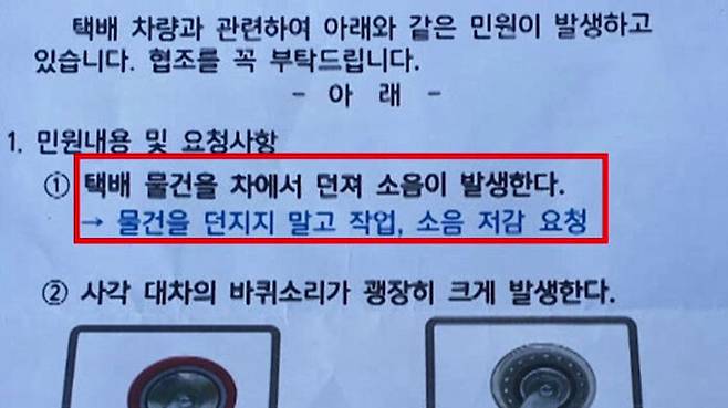 안내문에 없지만 택배차량 엔진 소리가 시끄럽단 민원도 여러 차례 제기됐습니다.
