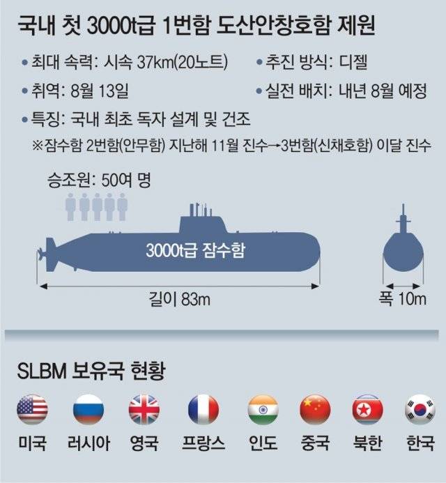 통상 SLBM 기술 개발은 지상 시험발사, 수중 시험발사, 잠수함 시험발사 등 3단계로 진행된다. 지난해 말 지상 시험발사에 성공한 군은 잠수함 대신 바지선을 이용해 얕은 물속에서 SLBM을 발사하는 2단계 수중 시험발사를 올해 마쳤다. SLBM 6기를 탑재할 수 있는 우리 군의 첫 3000t급 잠수함인 도산안창호함이 지난달 13일 취역하면서 관련 기술 개발에 속도를 내고 있는 것이다. 현재 SLBM 보유국은 미국, 러시아, 영국, 프랑스, 인도, 중국, 북한 등이다.
