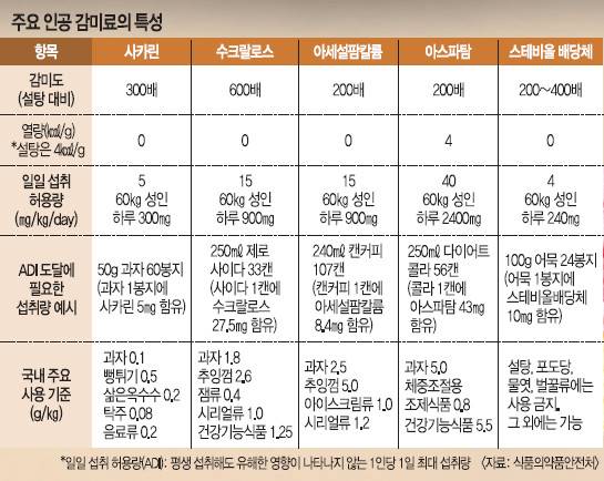 전문가들은 일부 유해성 논란에도 불구하고 정해진 허가 기준에 맞게 먹으면 크게 문제되진 않는다고 말한다. 식약처가 정한 ‘몸무게 당 일일 섭취 허용량(ADI)’은 사카린의 경우 하루 5㎎/㎏, 수크랄로스는 15㎎/㎏, 아세설팜칼륨은 15㎎/㎏, 아스파탐은 40㎎/㎏, 스테비올배당체는 4㎎/㎏이다. ADI 도달에 필요한 섭취량을 식품군별로 보면 과자(50g)는 60봉지, 제로 사이다(250㎖)는 33캔, 캔커피(240㎖)는 107캔, 다이어트 콜라(250㎖)는 56캔, 어묵(100g)은 24봉지에 해당된다. 즉 이 정도로 많이 먹어도 유해한 영향이 나타나지 않는다는 얘기다.