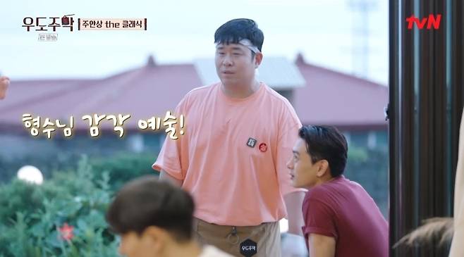 문세윤은 '김치훈'이 본명인 유태오에 대해 "본명이 너무 안 어울린다. 형수님이 예명 지어준 것이지 않나. 형수님 감각이 예술이다"며 유태오의 아내 니키 리의 감각을 높이 샀다. (사진=tvN '우도주막' 캡처)