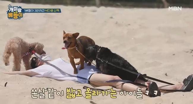 김민아가 모래밭에 대자로 뻗어버리자 반려견들은 누운 김민아의 몸을 한자리씩 차지하고 올라타 웃음을 자아냈다.
