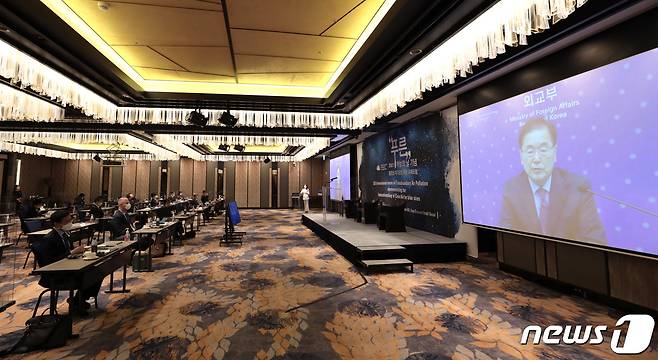 (서울=뉴스1) 이성철 기자 = 7일 서울 종로구 포시즌스호텔에서 열린 '2021 푸른 하늘의 날 기념 월경성 대기오염 대응 국제포럼'에서 정의용 외교부장관이 영상을 통해 인사말을 하고 있다. 2021.9.7/뉴스1