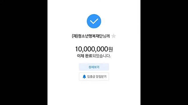 끝으로 그는 후원받은 돈 1000만원을 (주)청소년행복재단에 기부했음을 인증하는 스크린샷을 함께 공개했다.