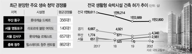 ‘생숙’이라는 줄임말로 잘 알려진 생활형 숙박 시설은 숙박업 등록이 필요하고 실거주가 허용되지 않는 비주택이지만 편법을 통해 주거용 상품처럼 공급되는 모습이다. 아파트 등 기존 주택에 대한 세금·대출 규제를 피하려는 수요가 몰리며 올 들어 진행된 주요 분양에 무려 60만 명이 몰린 것으로 나타났다.