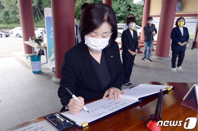 (광주=뉴스1) 정다움 기자 = 정의당 대권주자인 심상정 의원이 8일 오전 광주 북구 운정동 국립5·18민주묘지에서 참배에 앞서 방명록을 작성하고 있다. 2021.9.8/뉴스1