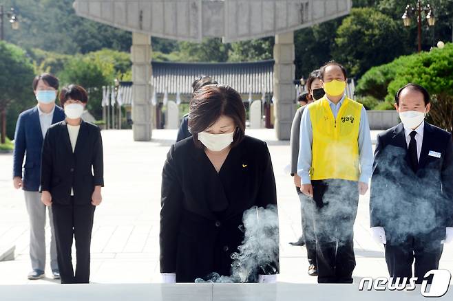 (광주=뉴스1) 정다움 기자 = 정의당 대권주자인 심상정 의원이 8일 오전 광주 북구 운정동 국립5·18민주묘지에서 오월영령에 참배하고 있다. 2021.9.8/뉴스1