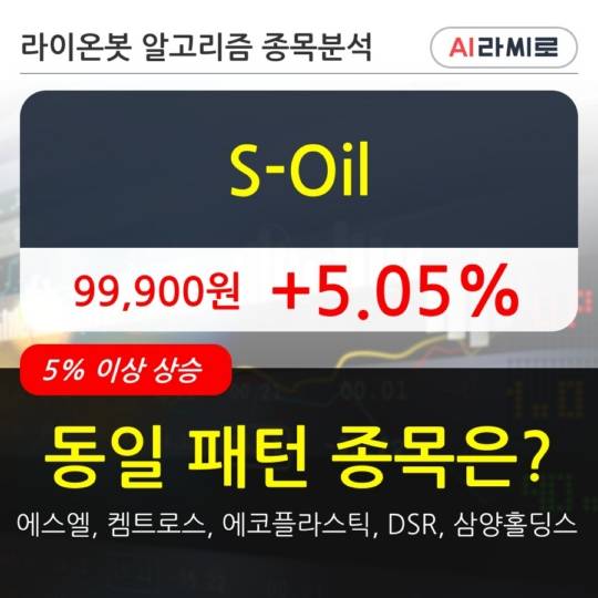 이 시각 거래소에서 S-Oil 이외에도 에스엘(5.4%), 켐트로스(14.22%), 에코플라스틱(16.13%), DSR(23.67%), 삼양홀딩스(5.22%) 등이 상승세를 보이고 있다.
