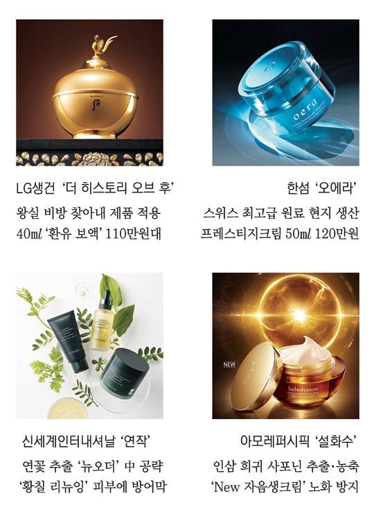 ◇프리미엄 화장품의 원조 ‘설화수’= 한방을 화장품과 접목한 프리미엄 제품의 시초는 아모레퍼시픽이다. 창립자 서성환 회장은 1960년대 프랑스의 향수 산지에 펼쳐진 꽃밭을 보고 인삼과 화장품의 결합을 상상하게 된다. 인삼 추출물 분석을 통해 피부에 좋은 성분을 하나씩 발견해나간 아모레퍼시픽은 1997년 ‘설화수’ 브랜드를 탄생시켰다. 아모레퍼시픽 연구진은 ‘동의보감’ 등 고서를 탐독하며 수천 가지 약재의 효능과 가공법을 탐구했다.