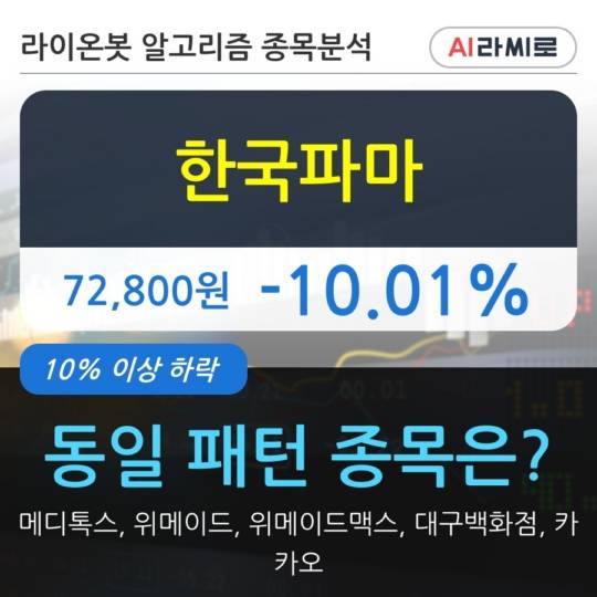 이 시각 거래소에서 한국파마 이외에도 메디톡스(-13.55%), 위메이드(-12.6%), 위메이드맥스(-12.06%), 대구백화점(-14.04%), 카카오(-10.39%)가 하락세를 보이고 있다.