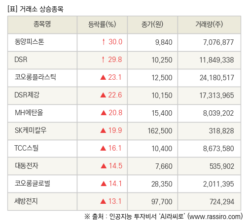 상승한 종목으로 동양피스톤(092780) 30.0%, DSR(155660) 29.8%, 코오롱플라스틱(138490) 23.1% 등이 있다.
