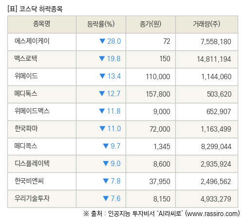 [fnRASSI]장마감, 코스닥 하락 종목(에스제이케이 -28.0% ↓)