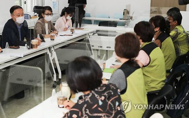 (서울=연합뉴스) 류효림 기자 = 이창준 보건복지부 보건의료정책관(왼쪽)이 8일 오후 서울 용산구 동자동 회의실 서울비즈센터에서 열린 코로나19 간호인력 배치기준 회의에서 인사말을 하고 있다. 2021.9.8