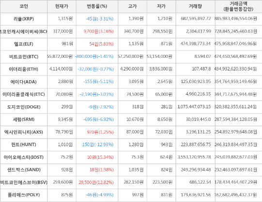 또한, 세럼(-6.92%, 9,345원), 에이다(-5.11%, 2,880원), 폴리매쓰(-4.99%, 875원), 리플(-3.31%, 1,315원), 이더리움클래식(-3.03%, 70,080원), 도지코인(-2.92%, 299원), 이더리움(-0.77%, 4,114,000원)이 하락세를 나타냈다.