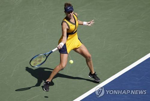 epa09455749 Belinda Bencic of Switzerland hits a return to Emma Raducanu of Great Britain during their quarterfinals round match on the tenth day of the US Open Tennis Championships the USTA National Tennis Center in Flushing Meadows, New York, USA, 08 September 2021. The US Open runs from 30 August through 12 September. EPA/JOHN G. MABANGLO