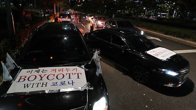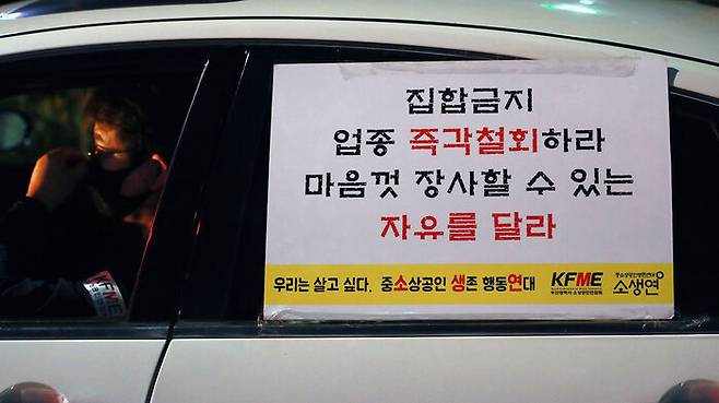 전국자영업자비대위가 9일 오전 여의도공원 인근에서 고강도 사회적 거리두기 조치로 생활고를 호소하며 방역지침 전환을 요구하는 차량시위를 하고 있다. 코로나19 대응 전국자영업자비상대책위원회는 이날 전국 9개 지역에서 동시다발 차량 시위를 진행했다.