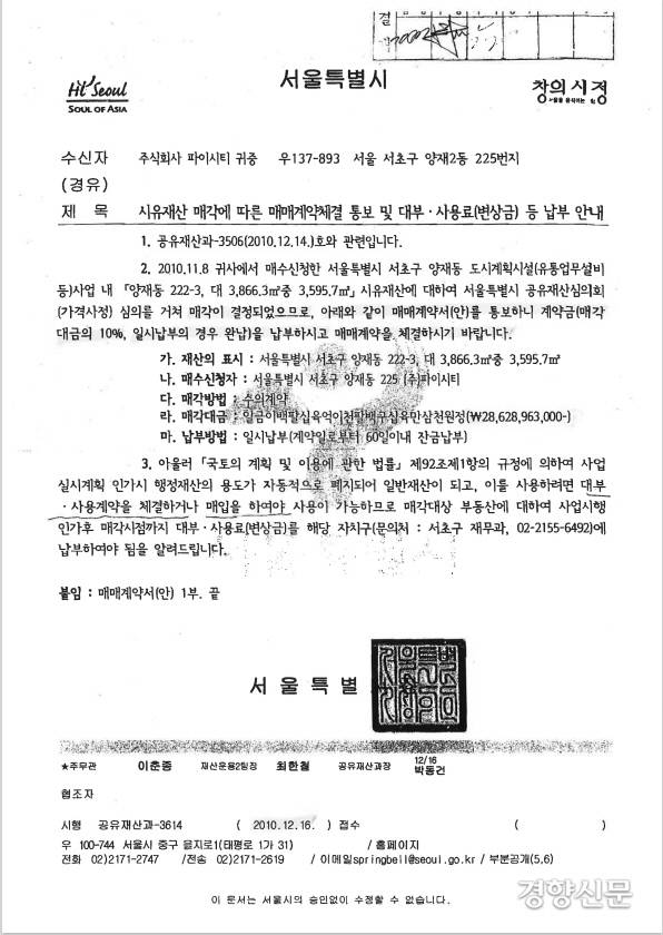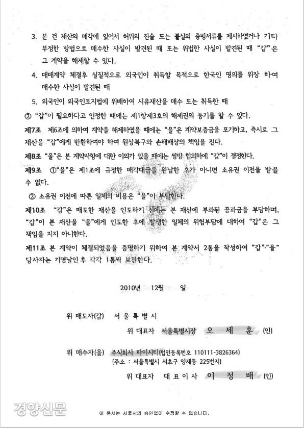 8일 경향신문이 김우철 더불어민주당 전문위원을 통해 확보한 서울시와 파이시티 간 2010년 12월16일 계약서를 보면, 서울시는 수의계약으로 파이시티에 양재동 땅 1089평을 평당 2726만원, 총 286억원에 매각하기로 했다.