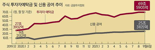 8일 금융투자협회 자료에 따르면 코로나19 사태가 터지기 전인 2019년 말만 해도 27조3932억원이었던 증시 투자자예탁금은 지난 8월 말 기준 69조5952억원으로 2.5배 이상 급증했다. 코로나19 사태에 따른 경제적 충격을 최소화하기 위해 한국은행이 기준금리를 0%대로 낮춰 유동성을 높인 결과, 부동산과 주식 시장에 돈이 몰리는 ‘머니무브’가 생긴 것이다.