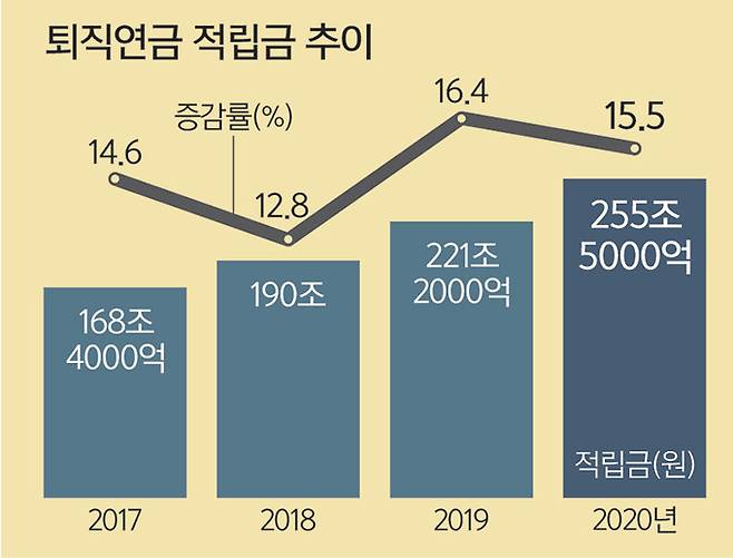 금융감독원 통계에 따르면 지난해 말 기준 퇴직연금 총 적립금은 2019년 말(221조2000억원)보다 34조3000억원 증가한 255조5000억원이다. 퇴직연금 적립금은 2017년 168조4000억원, 2018년 190조원 2019년 221조2000억원 등으로 기업의 퇴직연금 신규도입과 경과 연수에 따른 부담금 납입 증가, 세제혜택을 위한 근로자의 자기부담금 납입 증가 등으로 퇴직연금 적립금 규모는 늘어나고 있다.