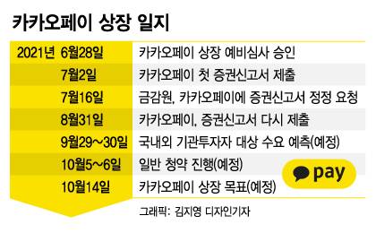 8일 금융·증권업계에 따르면 카카오페이는 10월 14일을 목표로 IPO를 준비 중이다. 9월 29~30일 국내외 기관투자자 대상 수요예측을 거쳐 최종 공모가를 확정하고, 10월 5~6일 일반 청약을 진행할 예정이다.