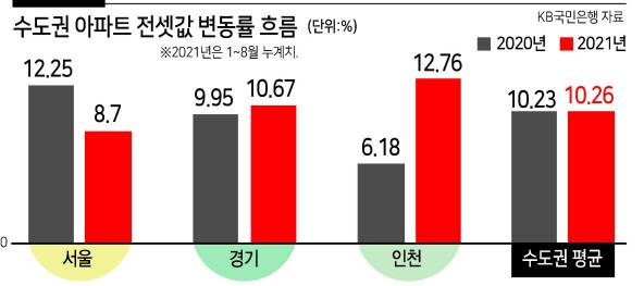 수도권 아파트 전셋값 폭등세는 경기도와 인천이 이끌고 있다. 특히 인천은 21년 내 가장 큰 전세 상승세다. 올 1~8월 인천 아파트 전셋값 변동률은 12.76%로 2000년 이후 가장 가파르다. 2000년 인천 아파트 전세는 1~8월 기준 13.04%, 연간 기준 15.09% 올랐다.