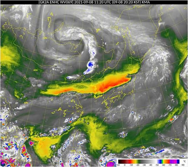 다만, 상층의 찬 공기 세력이 강해 한반도로 직접 올라오지는 못하고 동쪽으로 치우쳐 움직이면서 우리나라와 일본 사이를 지나갈 가능성이 큽니다.