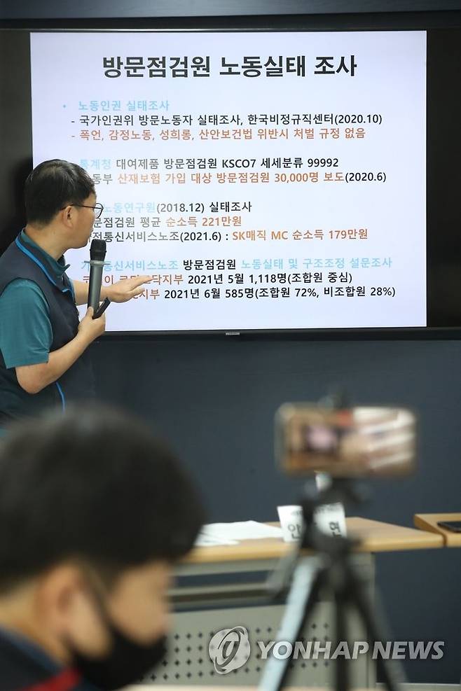 (서울=연합뉴스) 강민지 기자 = 9일 오후 서울 서대문구 전국가전통신서비스노동조합에서 열린 '코로나와 기술변화로 밀려나는 방문점검원 토론회'에서 김성혁 서비스연맹 정책연구원장이 발표하고 있다. 2021.9.9