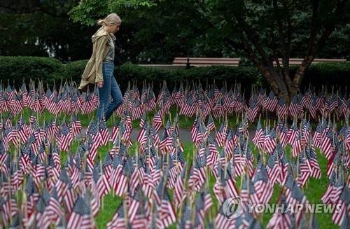 epa09457522 A passer-by walks through a garden of flags near the Garden of Remembrance, in the Boston Public Garden, in Boston, Massachusetts, USA, 09 September 2021. A local group planted the nearly 3000 in honor of the lives lost on 9/11. EPA/CJ GUNTHER