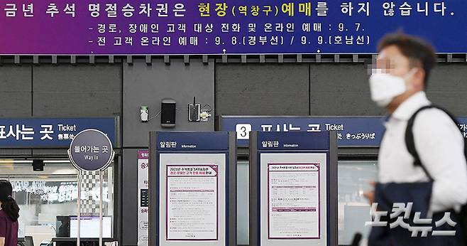 7일 오전 서울 강남구 SRT 수서역 매표소에 추석명절 승차권 비대면 예매 안내문이 붙어 있다. 수서고속철도(SRT) 운영사인 SR은 7일부터 9일까지 3일간 100% 비대면(온라인·전화접수)로 17일부터 22일까지 운행되는 모든 SRT 열차 승차권을 판매한다. 이한형 기자