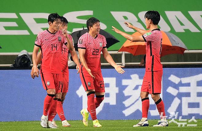 7일 오후 경기도 수원 월드컵경기장에서 열린 '2022 카타르 월드컵' 아시아지역 최종예선 A조 2차전 대한민국과 레바논 경기에서 권창훈이 골을 넣고 동료선수들과 환호하고 있다. 지난 2일 이라크와 1차전에서 0-0으로 비겼던 한국은 레바논을 잡고 1승1무(승점 4)를 기록했다. 이한형 기자