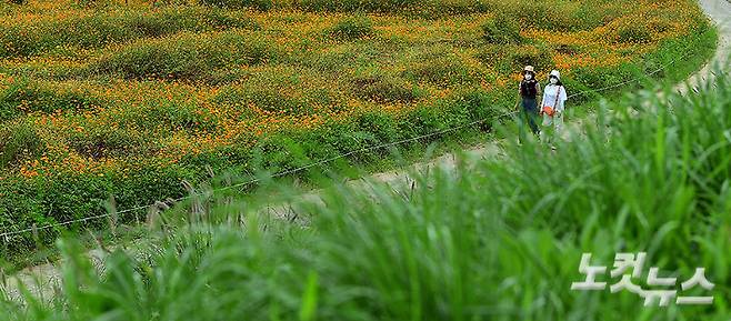 완연한 가을 날씨를 보이고 있는 5일 오후 서울 양천구 안양천 생태공원을 찾은 시민들이 황화 코스모스길을 걷고 있다. 황진환 기자