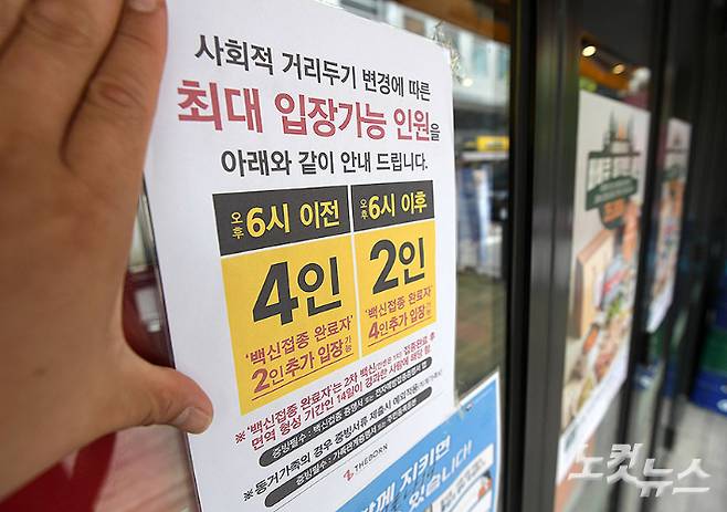 방역수칙 일부 완화가 포함된 현행 사회적 거리두기가 4주 연장 시행된 6일 서울 종로구의 한 식당에 안내문이 붙어 있다. 정부는 오늘부터 수도권 등 4단계 지역에서 식당·카페 영업시간을 밤 9시에서 10시로 다시 연장하며, 모임인원 제한도 백신 접종완료자가 낮에는 2인, 오후 6시 이후에는 4인 이상 포함될 경우에 한정해 6인까지 확대하며, 추석을 포함해 1주일간은 접종완료자 4명을 포함, 최대 8명까지 가정 내의 가족모임을 허용하기로 했다. 이한형 기자