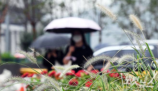 가을이 본격적으로 시작돼 흰 이슬이 맺힌다는 절기 '백로' 인 7일 오후 서울 청계광장 인근에서 시민들이 우산을 쓴 채 길을 걷고 있다. 황진환 기자
