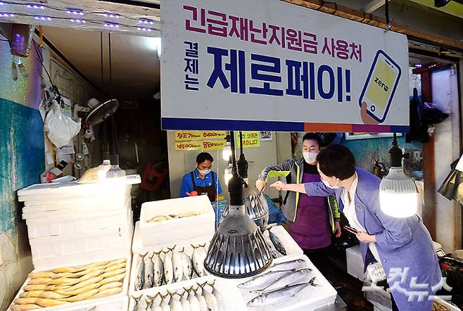 '1인당 25만원' 씩을 받는 코로나19 상생 국민 지원금(5차 재난지원금) 신청이 지난 6일 시작된 가운데 7일 오후 서울 서대문구 영천시장에 '재난 지원금 사용 가능' 안내문이 붙어 있다. 황진환 기자