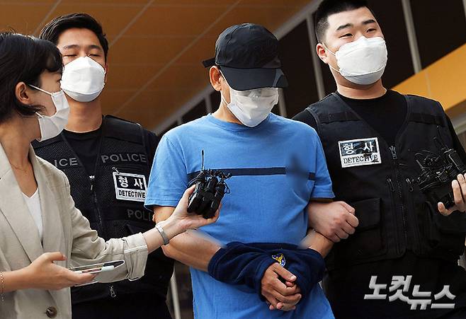 위치추적 전자장치(전자발찌)를 끊고 여성 2명을 살해한 혐의를 받는 강윤성이 7일 오전 서울 송파경찰서에서 검찰로 송치되고 있다. 이날 송파경찰서는 브리핑을 통해 "강씨가 지난달 25일 차량을 렌트하고 26일 흉기와 절단기를 사는 등 사전에 범행을 계획했다고 진술했다"고 밝혔다. 이한형 기자