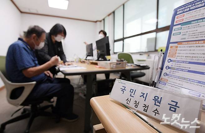 '1인당 25만원' 규모의 코로나 국민지원금 신청 접수가 시작된 6일 오전 서울 양천구 목1동 주민센터에서 어르신들이 안내를 받고 있다. 홈페이지 접속 장애 방지를 위해 대상자 조회, 온·오프라인 신청 모두 시행 첫 주에는 출생연도 끝자리에 따라 요일제를 적용한다. 끝자리가 1·6인 경우 월요일, 2·7인 경우 화요일, 3·8인 경우 수요일, 4·9인 경우 목요일, 5·0인 경우 금요일이다. 이한형 기자