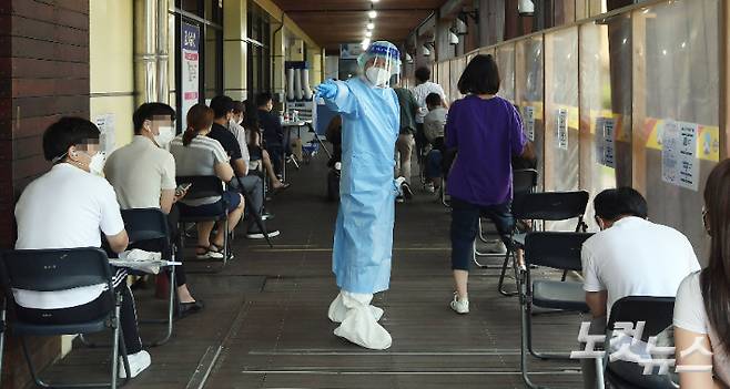 코로나19 신규확진자가 9월 들어 처음으로 2000명을 돌파한 8일 오전 서울 송파구 선별진료소에서 시민들이 검사를 받기 위해 줄 서 있다. 8일 중앙방역대책본부(방대본)에 따르면 이날 0시 기준 코로나19 신규확진자는 국내발생 2014명, 해외유입 36명 등 2050명으로 집계됐다. 이한형 기자