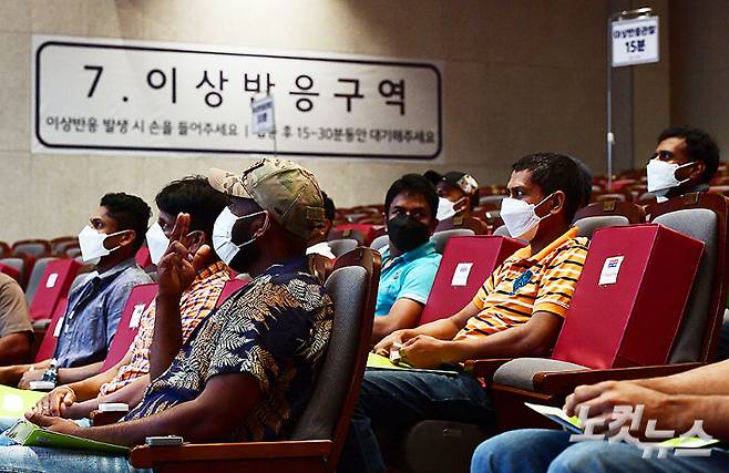 외국인 노동자들이 5일 오후 서울 구로구 예방접종센터에서 얀센 백신 접종 전 의료진의 설명을 듣고 있다. 황진환 기자