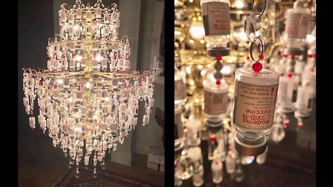 작은 유리병들이 모여 아름다운 샹들리에를 이뤘는데 자세히 보면 이 유리병들은 전부 모더나 백신 약병입니다.