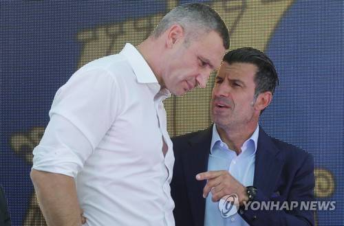 epa09459744 Kiev's Mayor and former heavyweight boxing champion Vitali Klitschko (L) speaks with Luis Figo (R), the former Portuguese professional footballer and Real Madrid player during the opening ceremony of the Real Madrid Foundation soccer school in the Kiev, Ukraine, 10 September 2021. Spanish LaLiga club Real Madrid CF develops its social and cultural programmes with Real Madrid Foundation which unites more than 450 football schools in 80 countries. Real Madrid Foundation helps to promote the values inherent in sport, and its role as an educational tool both in Spain as well as abroad. EPA/SERGEY DOLZHENKO