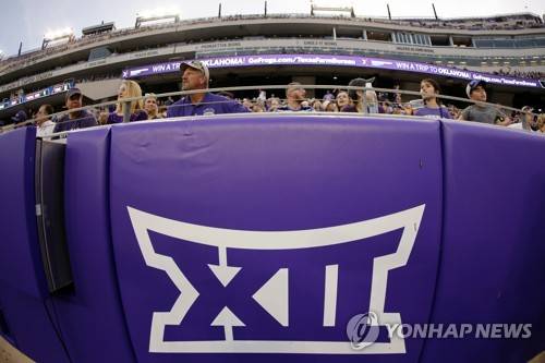 FILE - In this Saturday, Sept. 4, 2021, file photo, a Big 12 Conference logo is displayed on a barrier at Amon G. Carter Stadium before Duquesne played TCU in an NCAA college football game in Fort Worth, Texas. The Big 12 has extended membership invitations to BYU, UCF, Cincinnati and Houston to join the Power Five league. That comes in advance of the league losing Oklahoma and Texas to the Southeastern Conference. (AP Photo/Ron Jenkins, File) A SATURDAY, SEPT. 4, 2021, FILE PHOTO