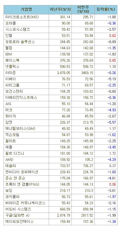 [표]미국 주요기업 주간 등락률