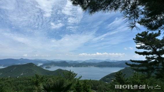 저멀리 거제도가 보이는 통영 미륵산 기슭 미래사 전망대입니다.