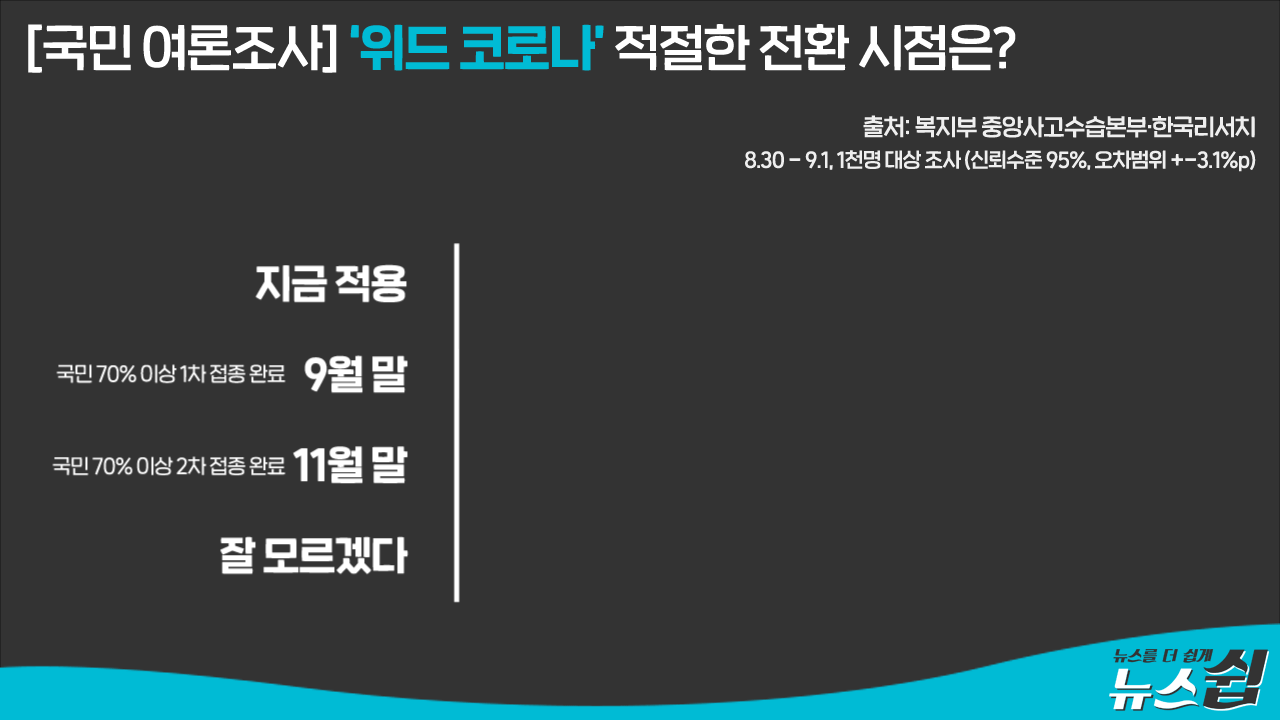 정부는 백신접종율이 높아짐에 따라 사회적 거리두기도 조금 완화했다. 현행 사회적 거리두기는 다음 달 3일까지 연장됐지만, 식당 영업시간은 오후 10시까지 1시간 길어지고, 모임 인원은 백신 접종 완료자를 중심으로 6∼8명으로 확대됐다. 거리두기는 유지하면서 일상생활 범위를 서서히 확대해 '위드 코로나'로의 전환을 준비하는 움직임으로 보인다.