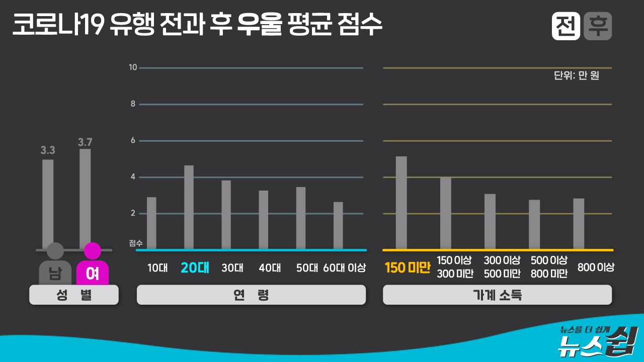 보이지 않는 위험 신호도 커지고 있다. 지난달 백종우 경희대병원 정신건강의학과 교수팀은 '코로나19 공중보건 위기에 따른 정신건강 및 사회심리 영향평가' 연구결과를 발표했다. 우울과 불안 지표는 코로나 유행 전에 비해 큰 폭으로 악화했다. 주요 정신건강 지표는 20, 30대 젊은 층과 여성에서 더 낮게 나타났다. 우울, 불안, 사회적 지지 부족 정도, 일상생활 장애 정도, 불면, 자살 경향성 등 정신건강 지표 전반에서 가계소득 300만 원 이하의 저소득층의 상황이 심각했다. (3월 26일~ 4월 29일까지 전국 성인과 14세 이상 청소년 1,150명 대상)
