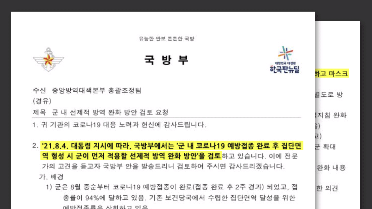 정부가 병사들을 대상으로 '노 마스크 실험'을 지시했다는 주장이 제기돼 논란이 됐다. 국방부 보건정책과는 지난 달 17일 마스크 해제 등 완화된 방역지침을 시범 진행하겠다는 계획을 세웠다. 이후 18일 질병청 산하 중앙방역대책본부 총괄조정팀에 관련 문건의 검토를 요청했다. 국방부는 '8월 말부터 9월 중순'까지 3주간 방역지침 완화 시범사업을 진행한 뒤 방역 위험을 평가해 전 군으로 확대하겠다고 계획했다. 중대본에 보낸 공문에서도 "8월 4일 대통령 지시에 따라 '군내 예방접종 완료 후 집단면역 형성 시 군이 먼저 적용할 선제적 방역 완화 방안'을 검토하고 있다"고 명시했다. 여기서 '선제적인 방역 완화'가 '마스크를 벗는 것이냐'를 두고 혼선이 빚어졌다.