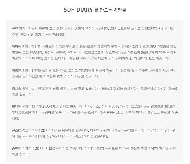 *** 이 기사는 매주 수요일 아침 발송되는 뉴스레터, SDF 다이어리에 소개됐습니다. SDF 다이어리는 SBS의 대표 포럼, SDF를 준비하는 SBS 보도본부 미래팀원들이 작성합니다. 우리 사회가 관심 가져야 할 화두를 앞서 들여다 보고, 의미 있는 새로운 관점이나 시도를 전합니다.